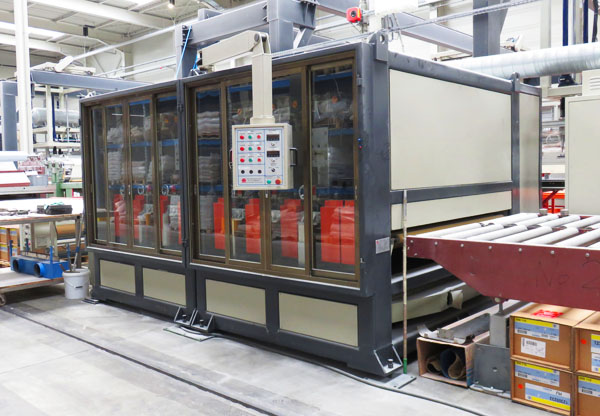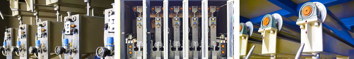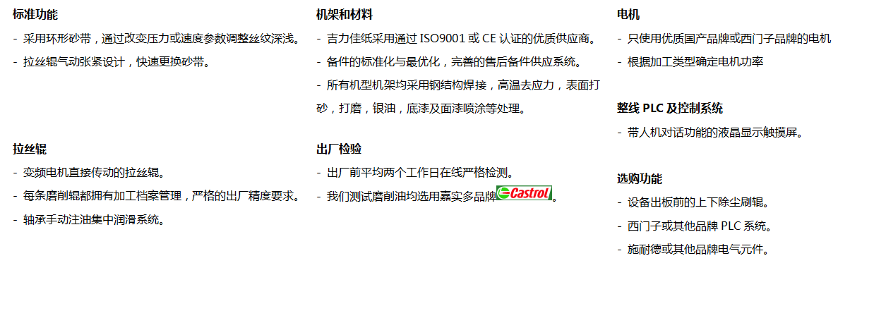 該系列設(shè)備有干拋或油拋兩種加工方式。經(jīng)過轉(zhuǎn)速極低的砂輥,通過調(diào)整砂輥向下的壓力,使套在砂輥外部的環(huán)形砂帶在金屬表面拉出直紋。經(jīng)過機(jī)組加工的直絲HLHair-Line)金屬板材,表面紋理清晰,縱向2米長(zhǎng)度內(nèi)直紋紋理的偏斜不超過2mm。